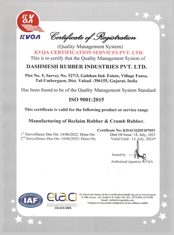 At Dashmesh Group, modern testing, processing and handling technologies have taken the traditionally-inspired production process even higher. All inputs are carefully selected and samples of every batch are additionally tested. Our ISO 9001:2015 certified by KVQA ensures effective quality systems, strict dimensional control and product relaibility by strenous chemical and physical tests. Findings are recorded and used for analysis and regular discussions with clients to maintian a common understanding of norms. Only after ensuring that the rubber quality meets international standards of ISO 9001:2015 are the consignments released for despatch.